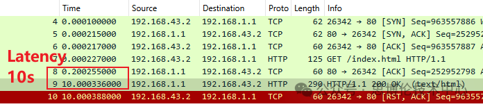如果我們不使用Think參數(shù)來保持連接,而是在服務(wù)器側(cè)通過服務(wù)器延遲響應(yīng)的方式來控制連接的時(shí)長,Avalanche模擬的服務(wù)器會(huì)在收到HTTP請求后等待Lantency的時(shí)間計(jì)時(shí)完成再回復(fù)響應(yīng)數(shù)據(jù),由于此時(shí)HTTP的會(huì)話也處于保持階段,因此采用這種方式來控制連接時(shí)長的方法我們稱之為七層并發(fā)。