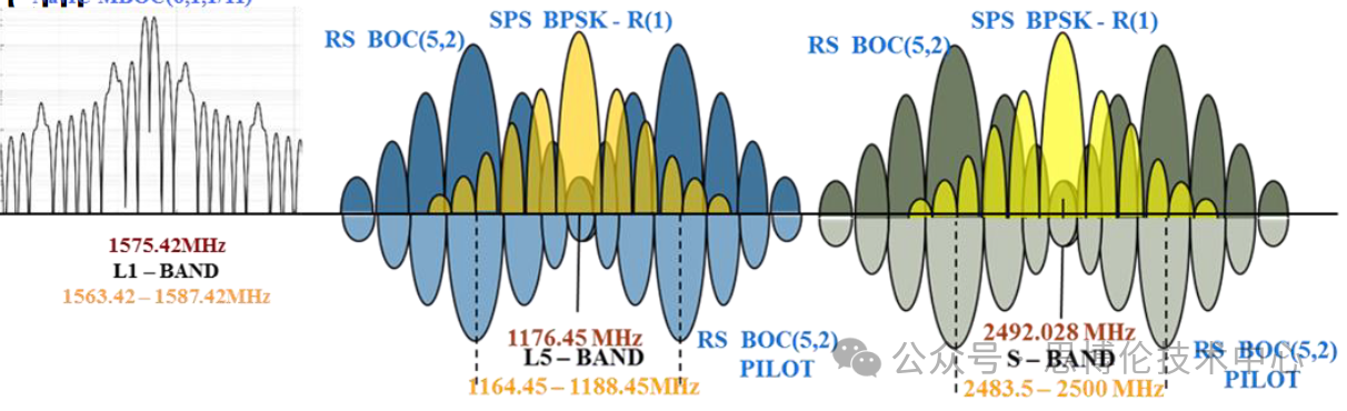 NavIC最早服務的信號是L5 頻率(1176.45MHz)和S band (2498.028MHz)頻段。目前最新在2023年5月發射的NVS-01衛星新增一個民用信號L1 (1575.42MHz)投入使用, NavIC L1信號和其他GNSS L1一樣有較高的兼容互操作性,共享同一個“黃金頻率波段”。