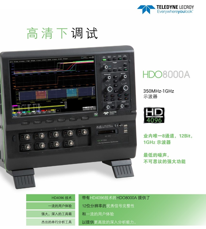 HDO8000示波器提供8個模擬輸入通道,采用力科HD4096高分辨率技術,有著高達12-bit的垂直分辨率,且帶寬高達1GHz,是用于調試三相電力電子,汽車電子和機電系統的理想工具。