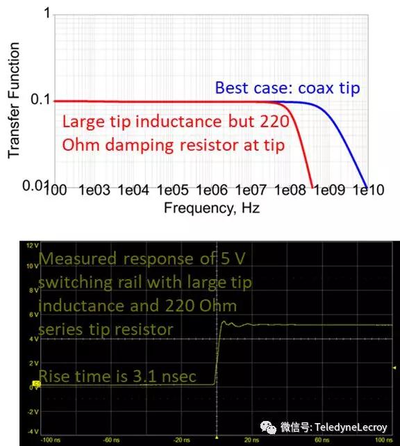 最小化10x無(wú)源探頭的前端電感很重要,在測(cè)量低阻抗電源軌時(shí),任何前端電感都可能引起人為的振鈴,在前端增加一個(gè)大約200歐姆的串聯(lián)電阻會(huì)減少這種誤差,但也會(huì)將探頭的帶寬降低到100 MHz或更低。如果您的電源軌測(cè)試應(yīng)用需要高于100 MHz的帶寬,請(qǐng)考慮使用諸如力科RP4030有源電源軌探頭之類的探頭,該探頭沒有此限制。